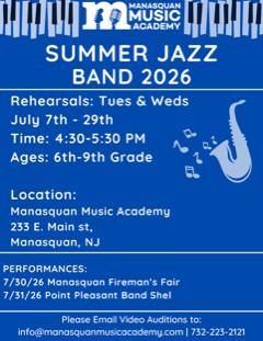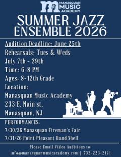 Manasquan Music Academy will hold auditions for the annual MMA Summer Jazz Ensemble. MMA Summer Jazz Ensemble is an audition-only instrumental music study intensive, providing students with the opportunity to explore the vast and diverse world of jazz. Led by Wall High School Music Teacher Steve Bryant; Wall Township Band Director Mike Montalto; and East Brunswick Music Director Ryan Wiemken, the MMA Summer Jazz Ensemble will select up to twenty-one 8th-12th grade students to join the ensemble, which includes intensive instruction through an affordable tuition based four-week summer course. This program offers an opportunity for student musicians to be exposed to all areas of jazz repertoire, encourages the practice through the summer months and provides performance opportunities.